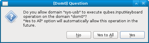 qvm-usb -a gpgvm $USB_DEVICEOne final note: When you plug your Yubikey into your computer (and you’re using a USB qube), a question might pop up in a dom0 window asking if you’d like to allow the USB keyboard you plugged in to sys-usb to type in dom0. This is because Yubikeys advertise themselves as USB keyboards — this makes it possible to press the button on the Yubikey to type a two-factor authentication code.