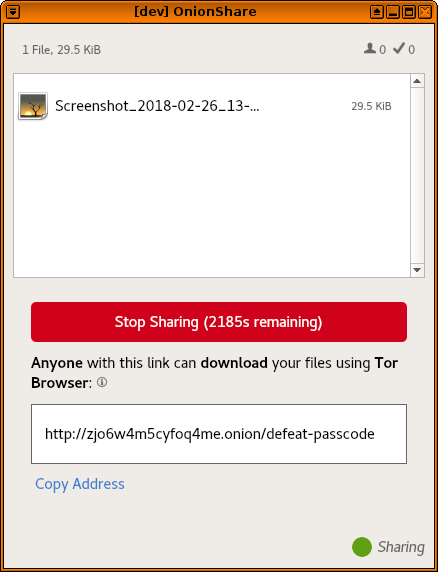 http://lldan5gahapx5k7iafb3s4ikijc4ni7gx5iywdflkba5y2ezyg6sjgyd.onion/I’ve described some of the newest and biggest features in OnionShare, but it’s not nearly an exhaustive list. There are many more, including a system tray icon with desktop notifications, the ability to cancel shares before they finish starting, translations into several languages, checking for updates automatically, among others. Oh, and since January 2017, OnionShare has been built-in to the Tails operating system too!