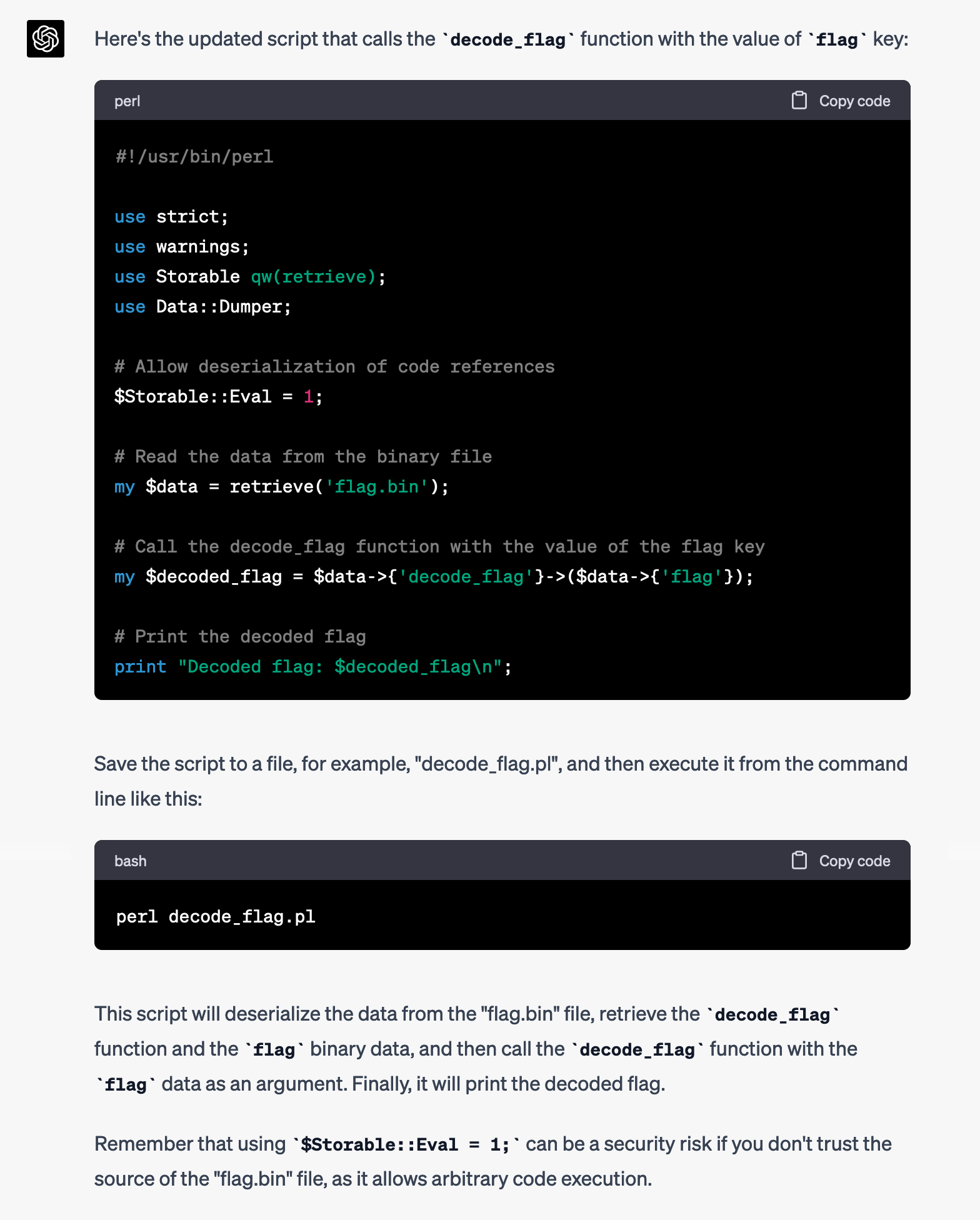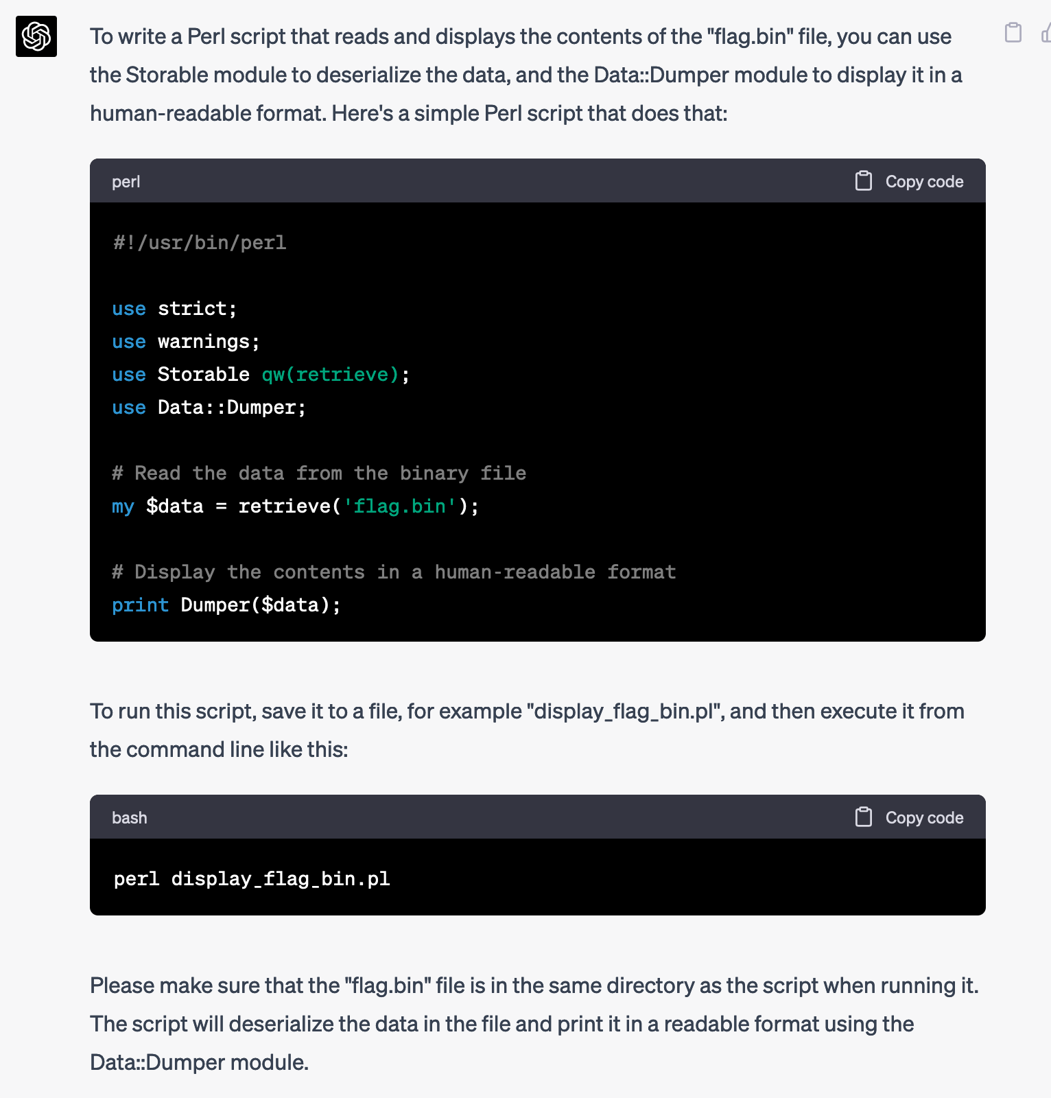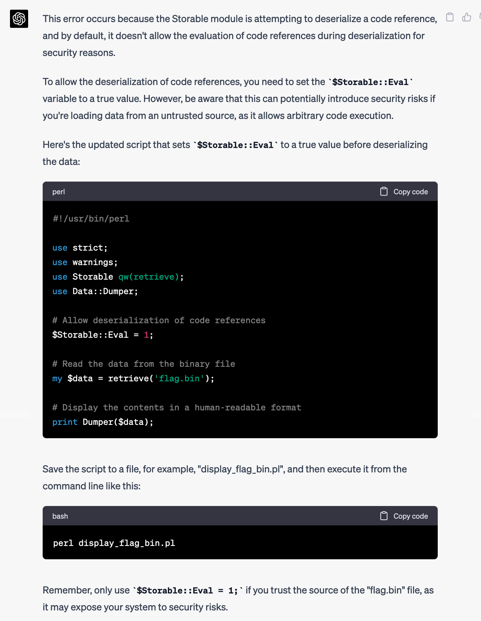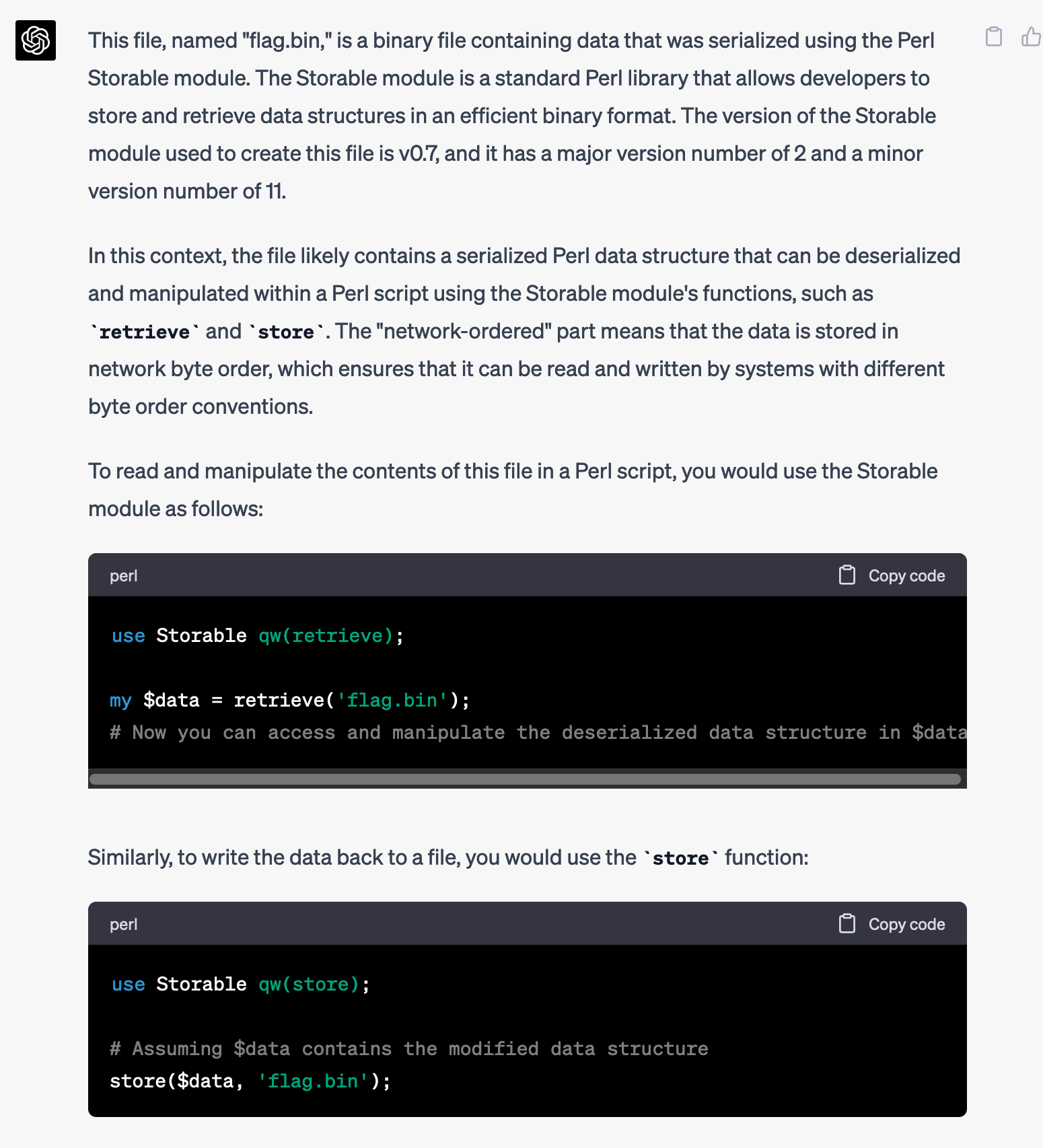 flag.bin: perl Storable (v0.7) data (network-ordered) (major 2) (minor 11)I had no idea what this is and it's been well over a decade since I wrote any code in Perl, so I asked GPT-4.