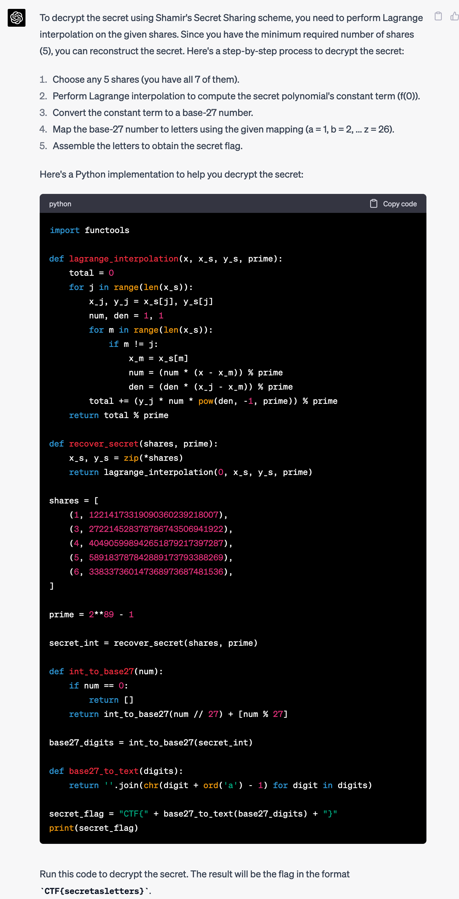 In this challenge, I had to walk around the BSides SF venue looking for QR codes to scan. In Shamir's Secret Sharing scheme, a secret is divided into a certain number of parts, and if one person has a threshold of those parts they can decrypt the secret. In this case, there were 7 parts with a threshold of 5, and I wandered around and found 6 of them on QR codes. I then simply asked GPT-4 to solve the problem for me: