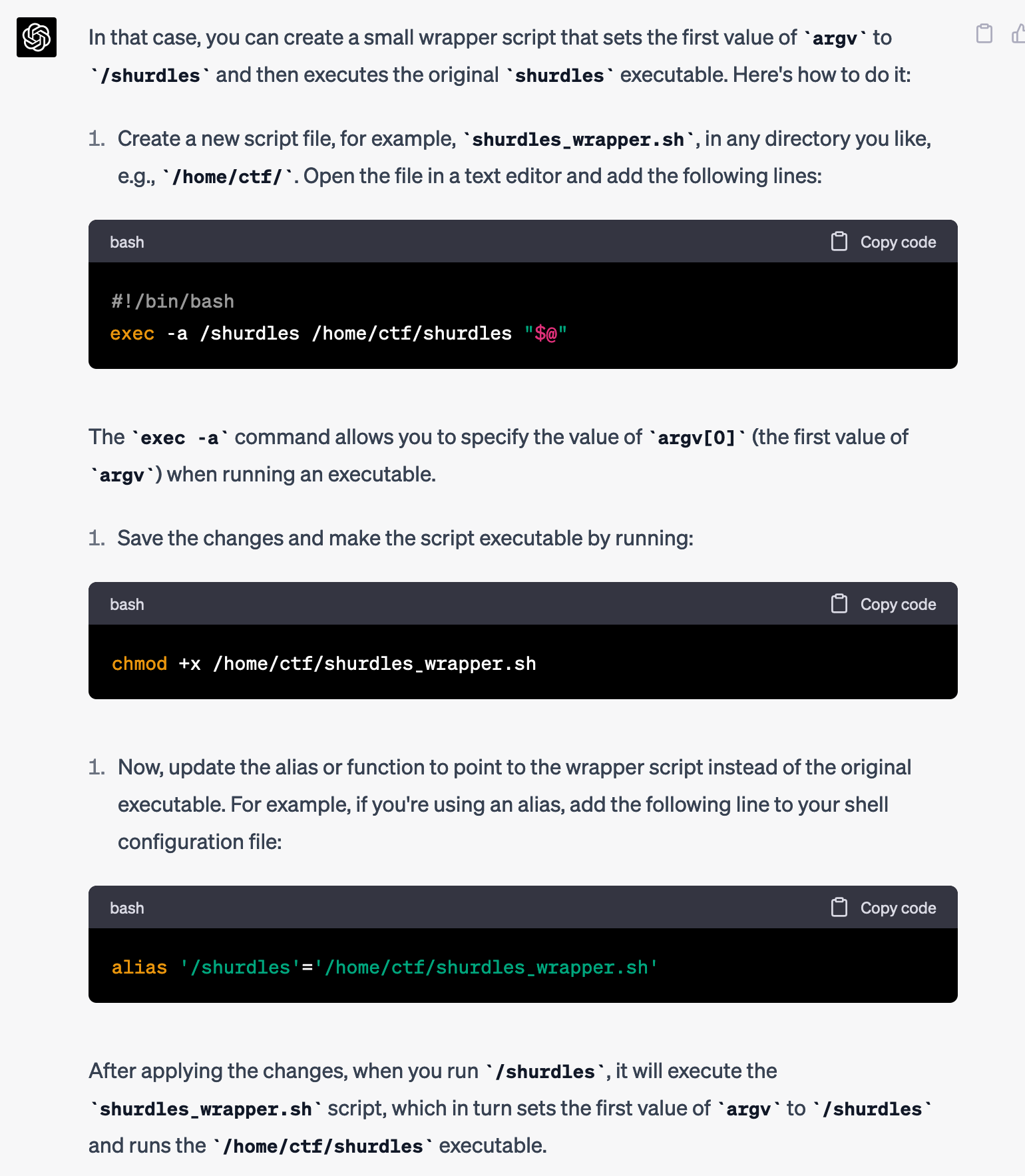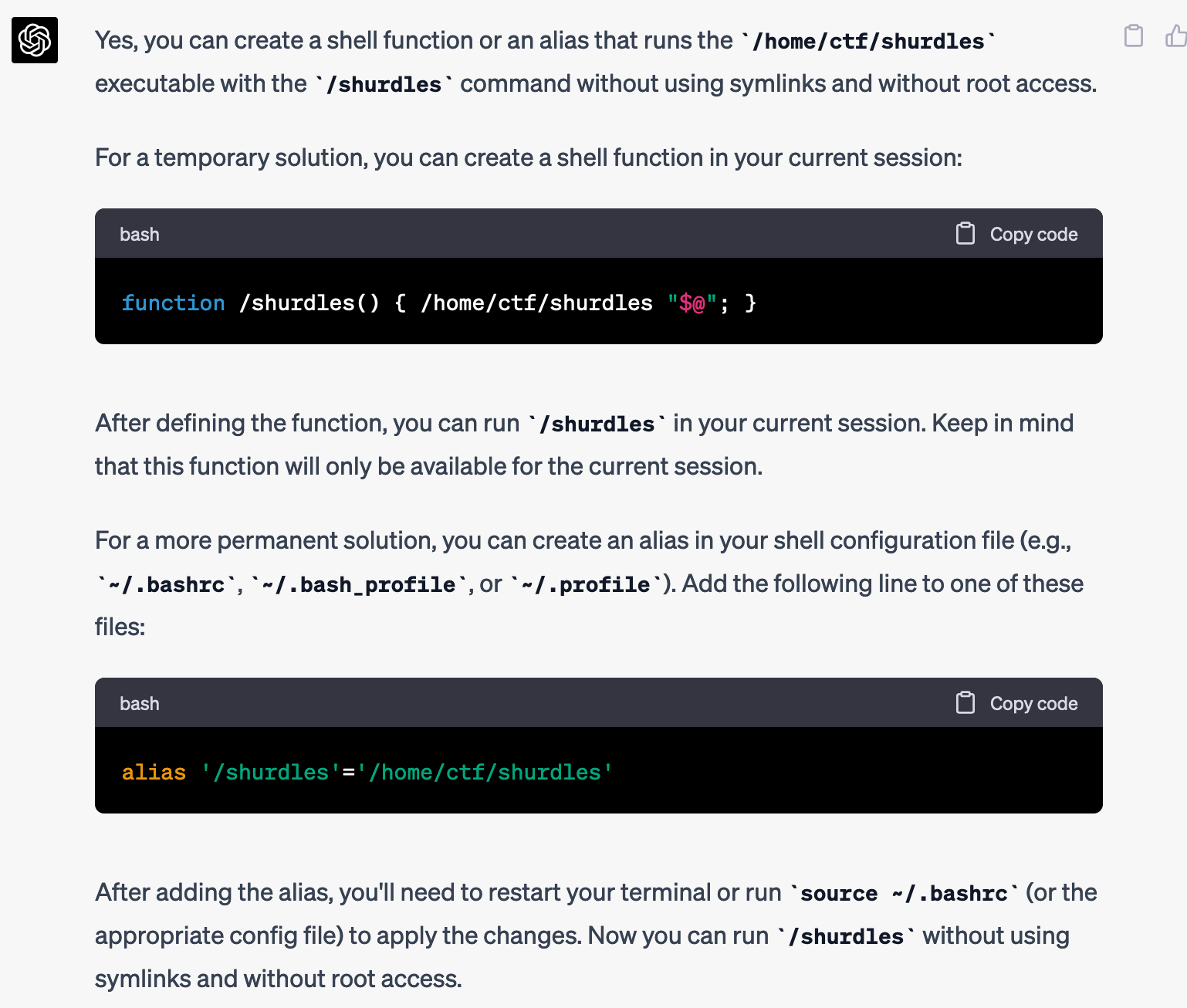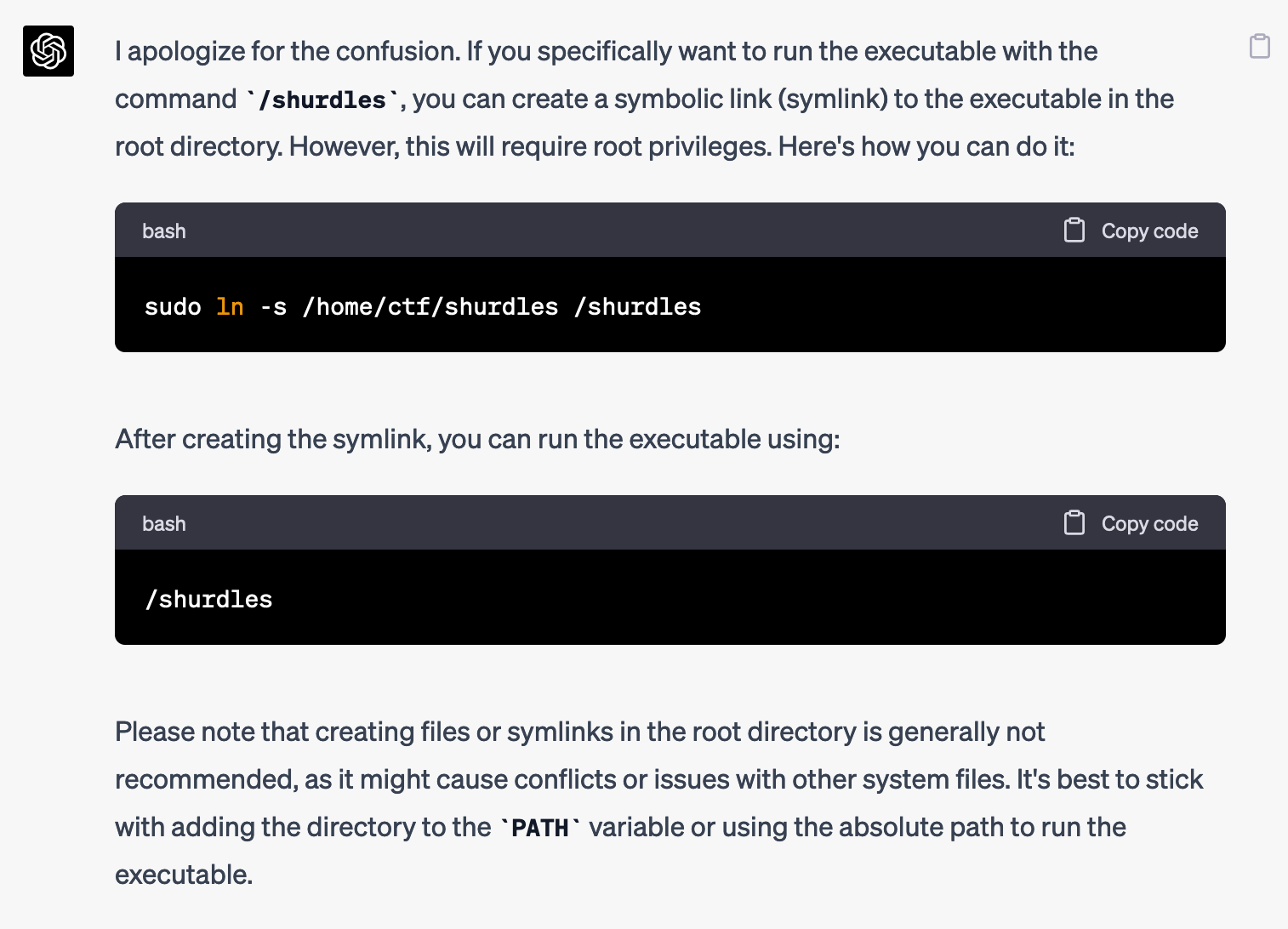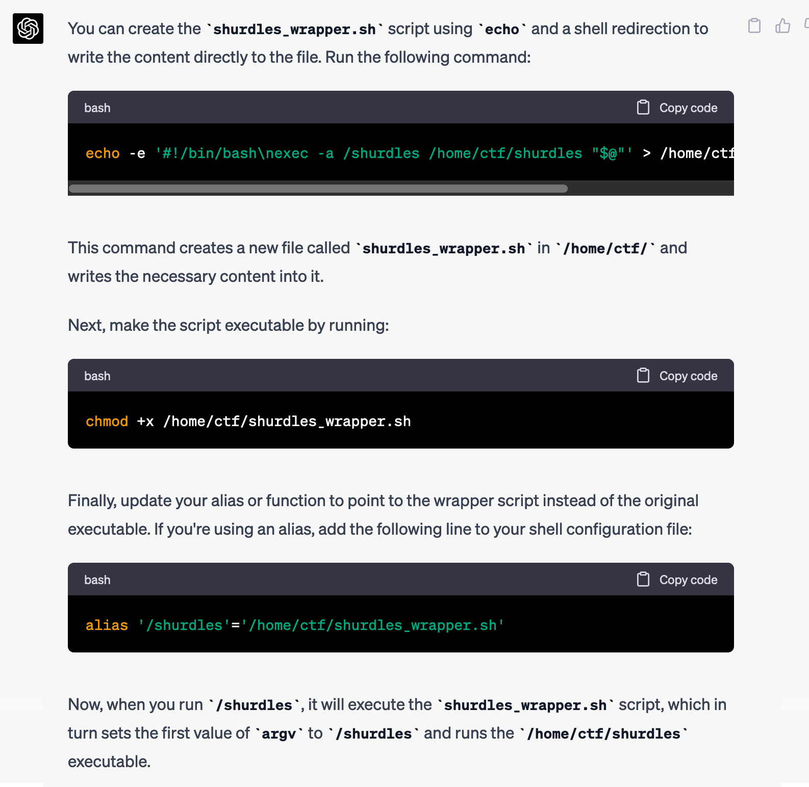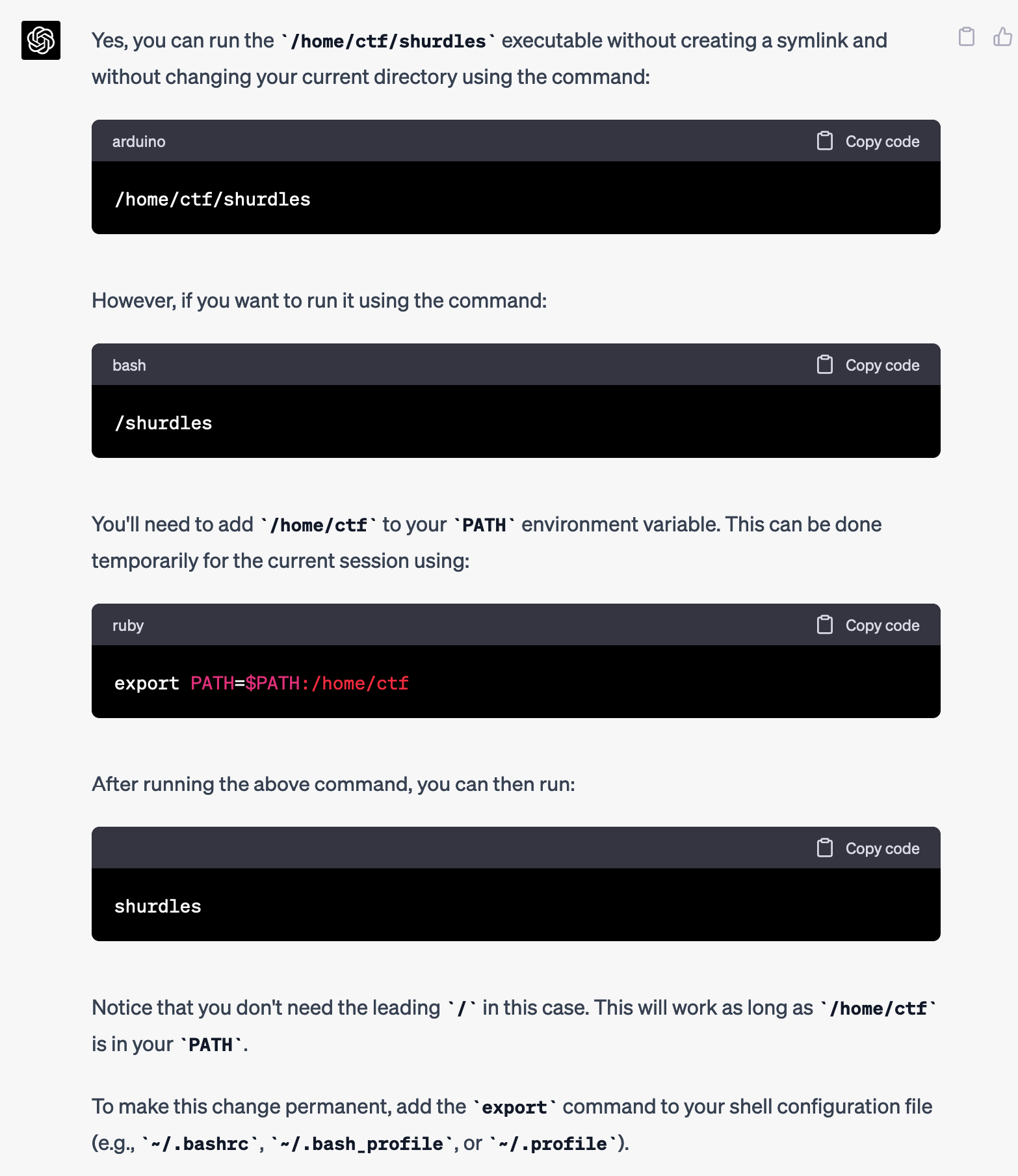 It responded with a decent idea: add /home/ctf to my PATH so I can just run shurdles, though it wasn't perfect.