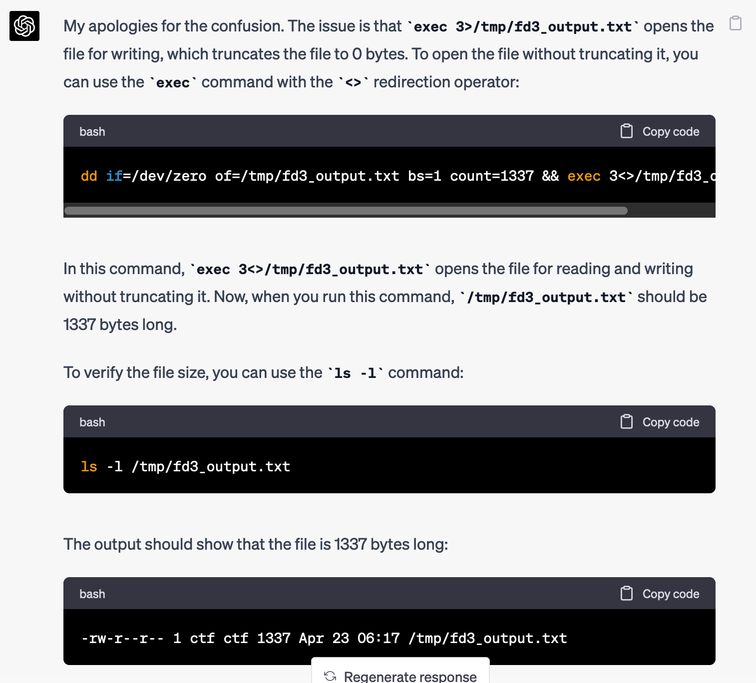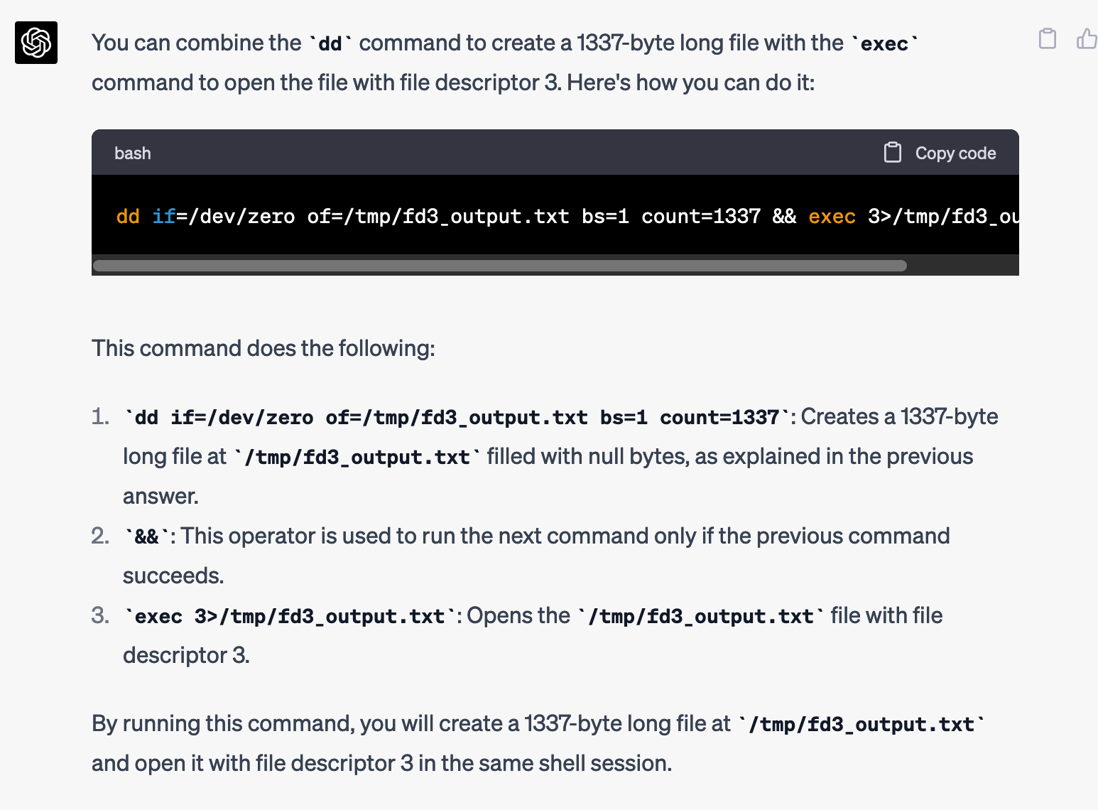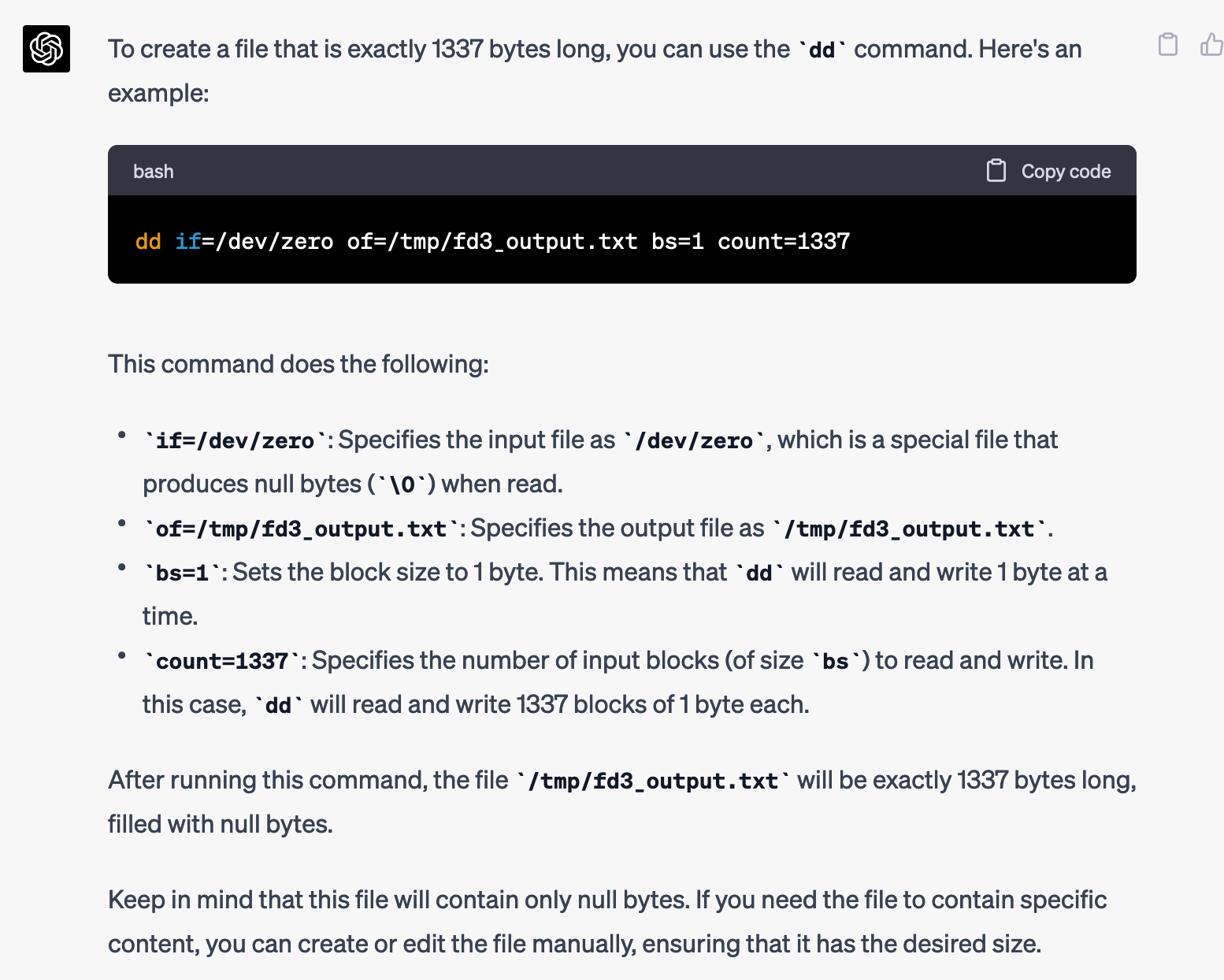 shurdle 6 failed: expected fd 3 to be a file of 1337 bytes in lengthProgress! So I need /tmp/fd3_output.txt to be 1337 bytes long. I knew how to do this, but thought it would be faster to ask GPT-4 than to look up the specific dd arguments, or write Python code, or however I wanted to do it.