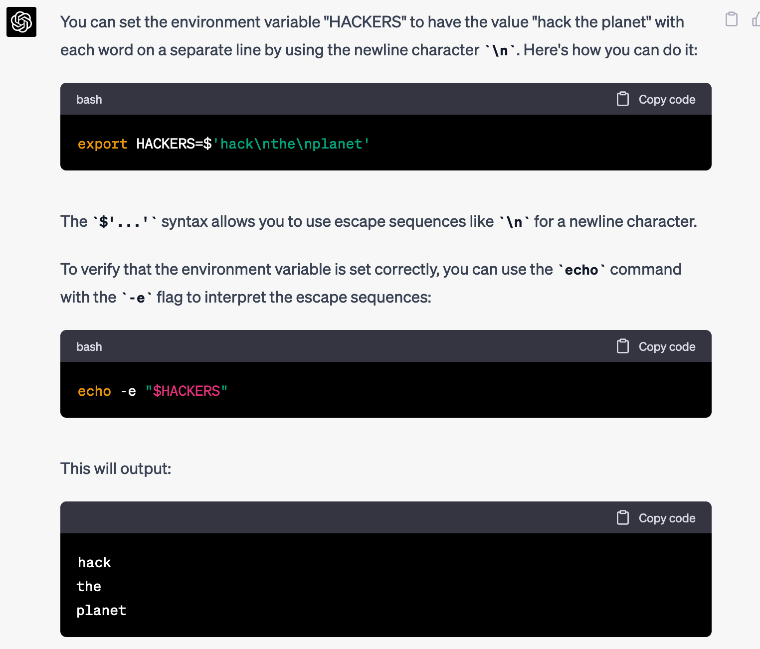 shurdle 3 failed: I expected the environment variable "HACKERS" to look like hack the planet on separate linesGot past that shurdle! And onto the next. I could totally figure this one out, but why not save time and get GPT-4 to do it for me?