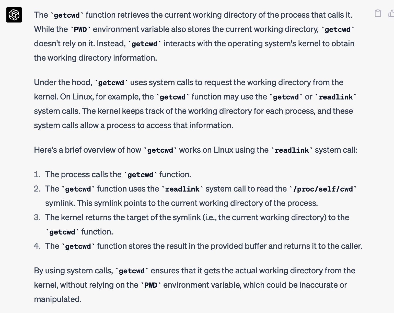 shurdle 5 failed: expected workdir "/run/. -- !!"Onto the next shurdle. This one confused me a bit. I asked GPT-4 how I could make my current working directory look like: /run/. -- !!, without actually creating that folder and changing to it. It had some good ideas, including running export PWD='/run/. -- !!' before running the command, but it didn't work. I asked it the different ways a command can learn its working directory, and it told me it can use the PWD environment variable, but also the getcwd function. When I asked how getcwd learned the working directory without the PWD environment variable, it gave me a detailed answer.