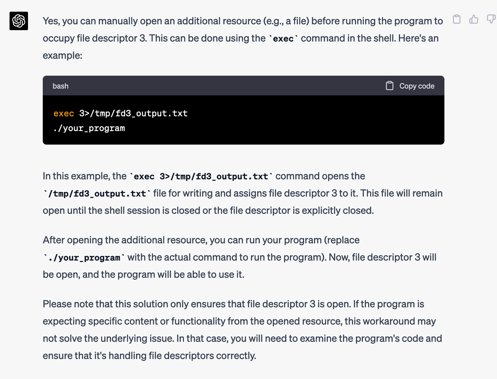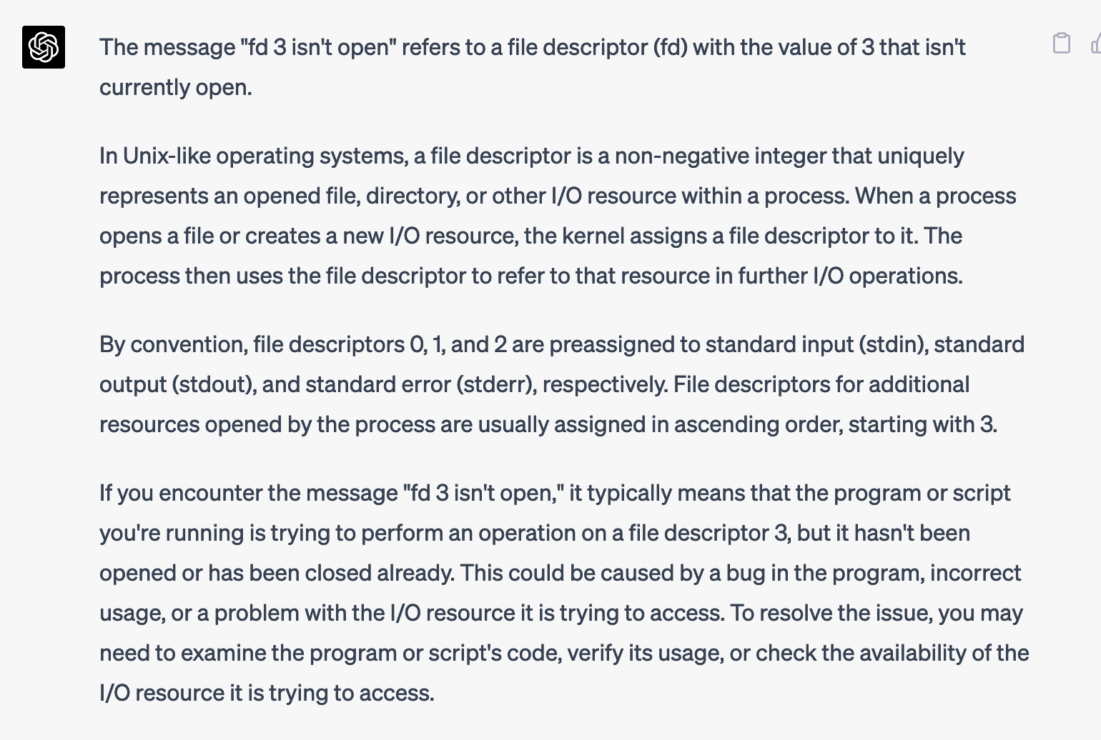 shurdle 6 failed: fd 3 isn't openI didn't quite know what this one meant. Did I have to open a file or something? I asked GPT-4.