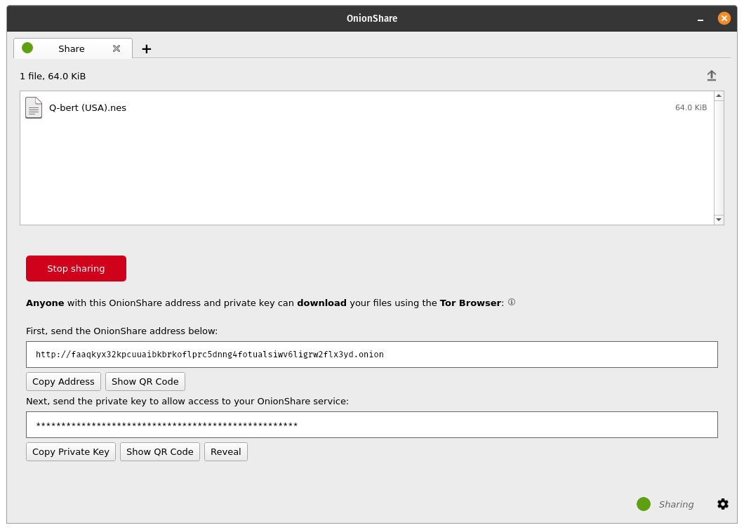 K3N3N3U3BURJW46HZEZV2LZHBPKEFAGVN6DPC7TY6FHWXT7RLRAQWhen you start an OnionShare service you get both, and you have to give both to the people who want to use your service. For example, lets say you want to send a super secret Nintendo ROM to your friend. You open OnionShare, drag the file in, and start the server.