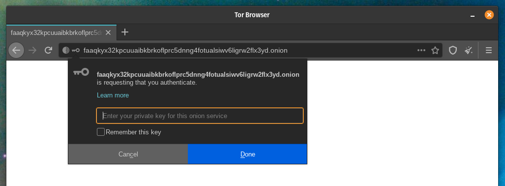 You open up an encrypted messaging app like Signal and then send both the OnionShare address and the private key. When your friend opens Tor Browser and pastes the address, Tor itself will pop up a little window asking for the private key.