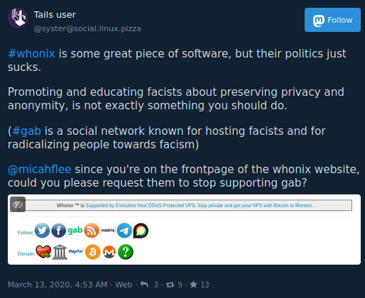 Then earlier this year someone reached out to me on Mastodon, the open source federated social network, to point out that the Whonix project has an account on Gab.
