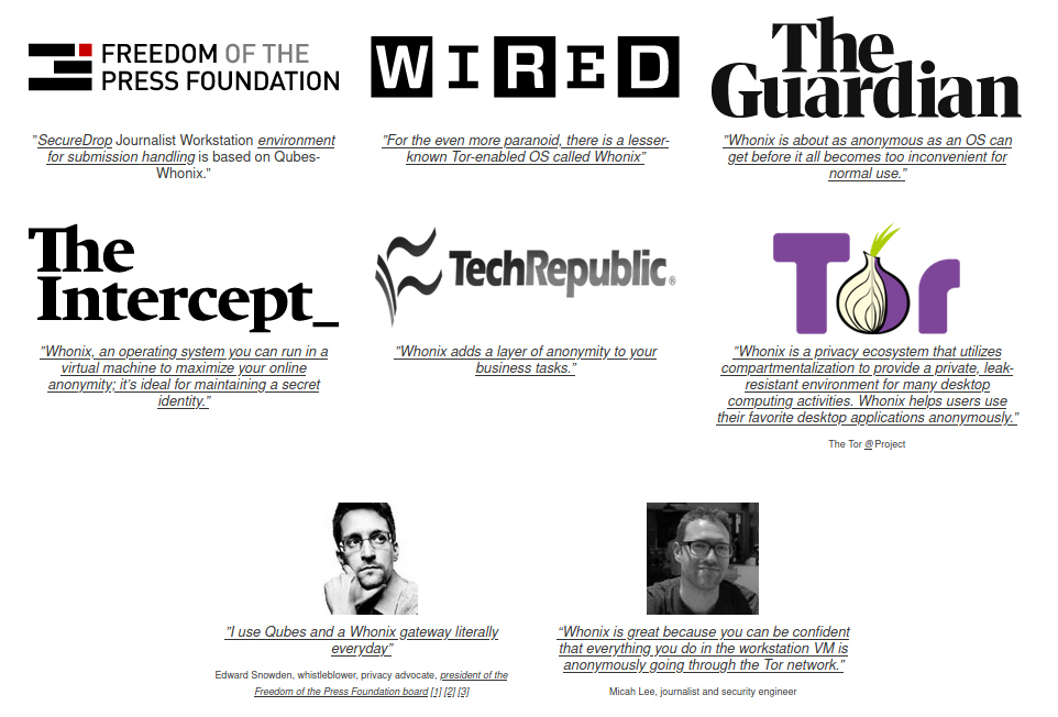 Until today, I was indeed on the front page of the Whonix website (quoting an article I wrote for the Intercept about VMs), along with Snowden and quotes from a bunch of organizations that I think might not be happy with associating with Whonix if they knew about the project's apparent fascist sympathies.