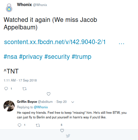 Jacob Appelbaum is a serial rapist who, in 2016, was kicked out of Tor Project and the internet freedom community after a group of his victims organized to expose him. The link in the Whonix tweet was to a copy of Citizenfour, Laura Poitras's 2014 documentary about Edward Snowden, which featured Appelbaum before he was exposed as a sexual predator.