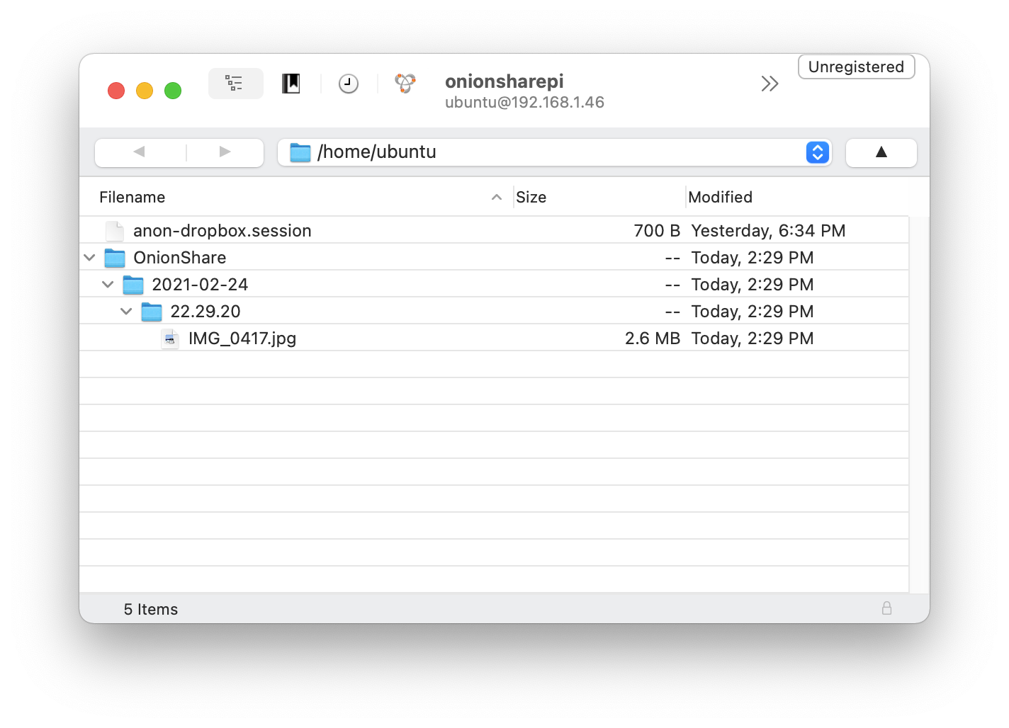 If you quit OnionShare by pressing Ctrl-C, then run that same command over again (in the terminal press up arrow, then enter), it should start OnionShare again, and the URL should be exactly the same. This is important because if you ever have to quit OnionShare (like maybe you need to unplug the Raspberry Pi and plug it in somewhere else, forcing it to reboot), you'll be able to get your anonymous dropbox up and running again with the same address.