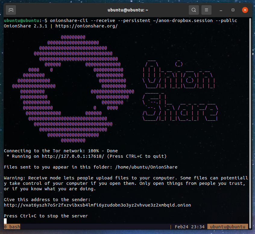 onionshare-cli --receive --persistent ~/anon-dropbox.session --publicThis stores all the settings associated with this session, including the secret key required to get this same Tor onion address, in the file anon-dropbox.session.