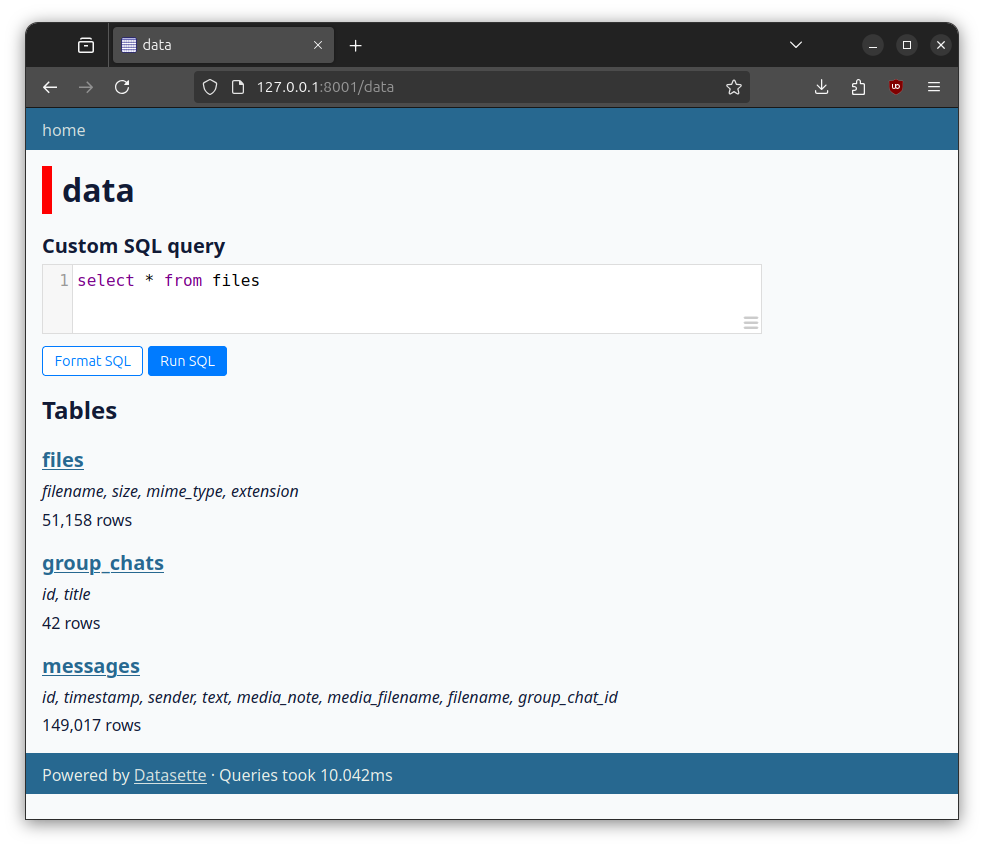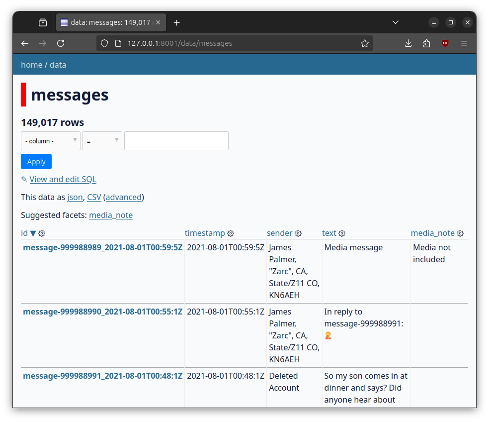 - A browser with Datasette loaded so I can make searches and read through the messages.