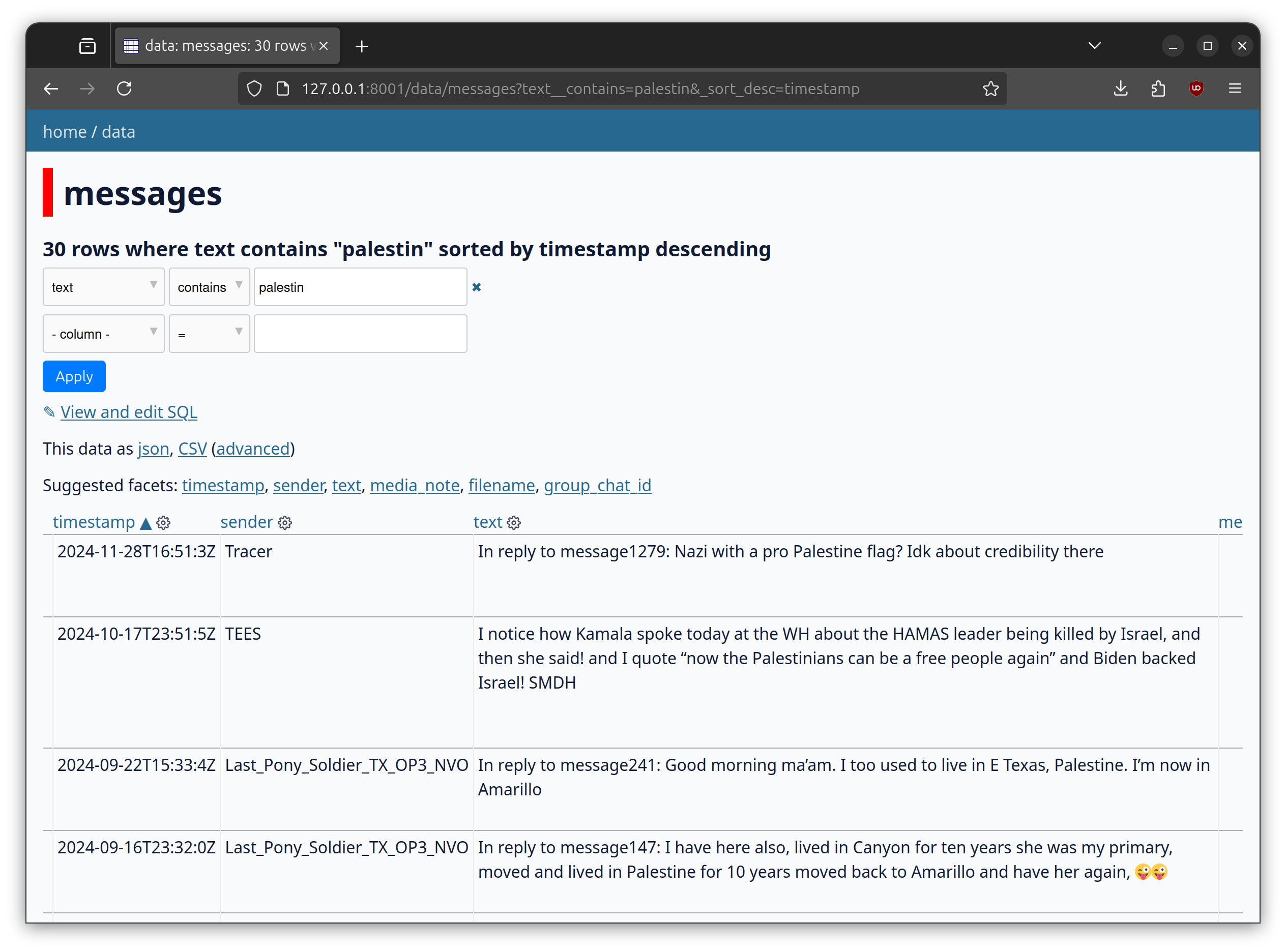 At the top there's a - column - dropdown to apply filters. Here I'm searching for messages that contain the string palestin (to encompass both "Palestine" and "Palestinian"), and I clicked timestamp to sort the messages descending (the most recent first):