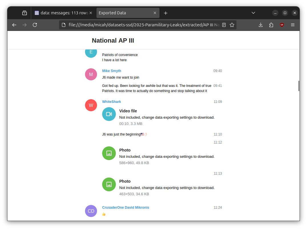 poetry run tasks build-db /media/micah/datasets-ssd/2025-Paramilitary-Leaks/extractedThis will loop through every folder in your dataset looking for exported Telegram chats (message*.html files). For each of these files, it will loop through the HTML slurping up all of the messages and saving them in a SQL database. Here's what it looks like: