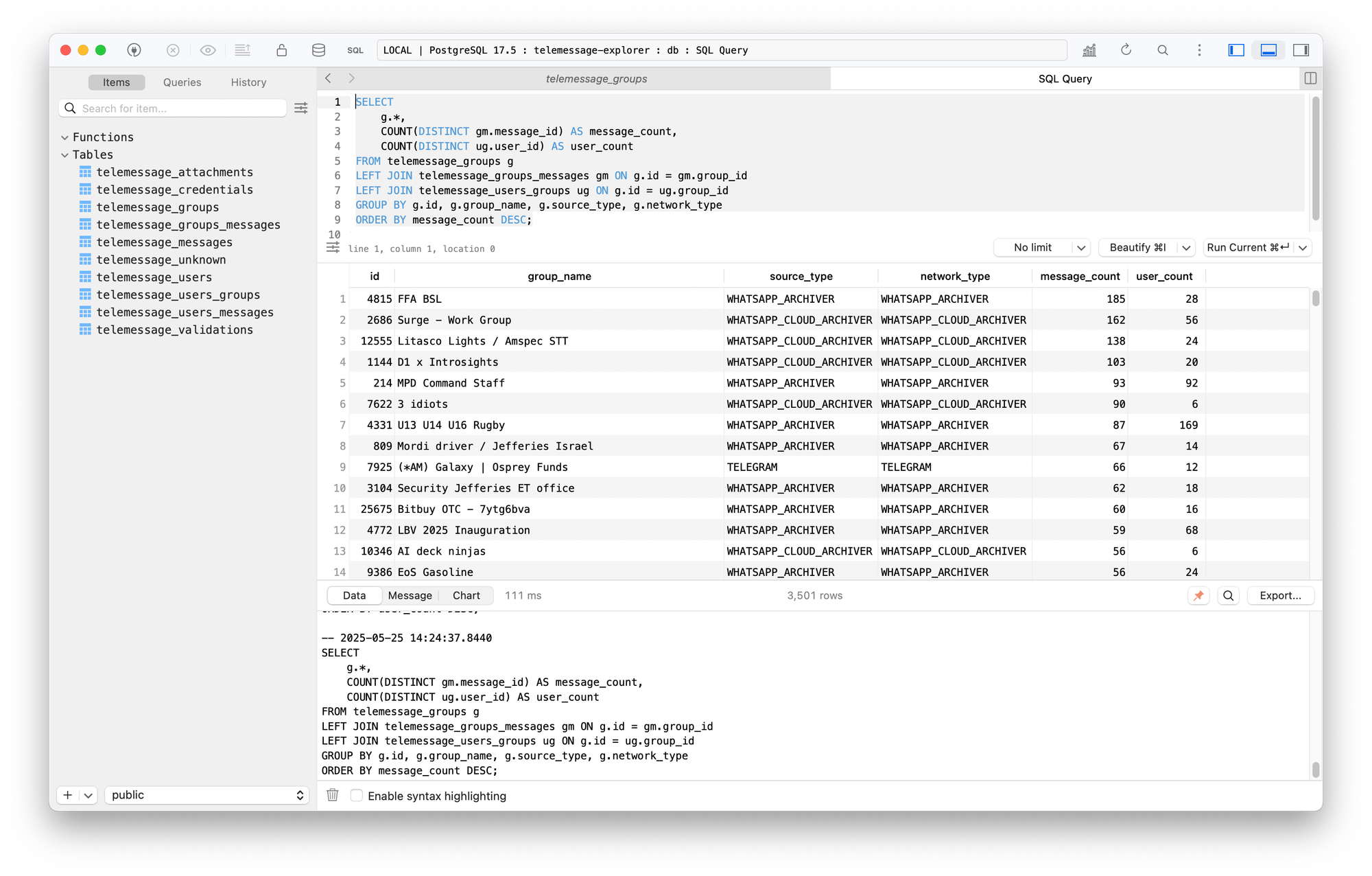 In the following screenshot, I ran a query (using TablePlus) that selected everything from all groups, joined them with the number of messages and users in each group, and sorted them by the groups with the most messages.