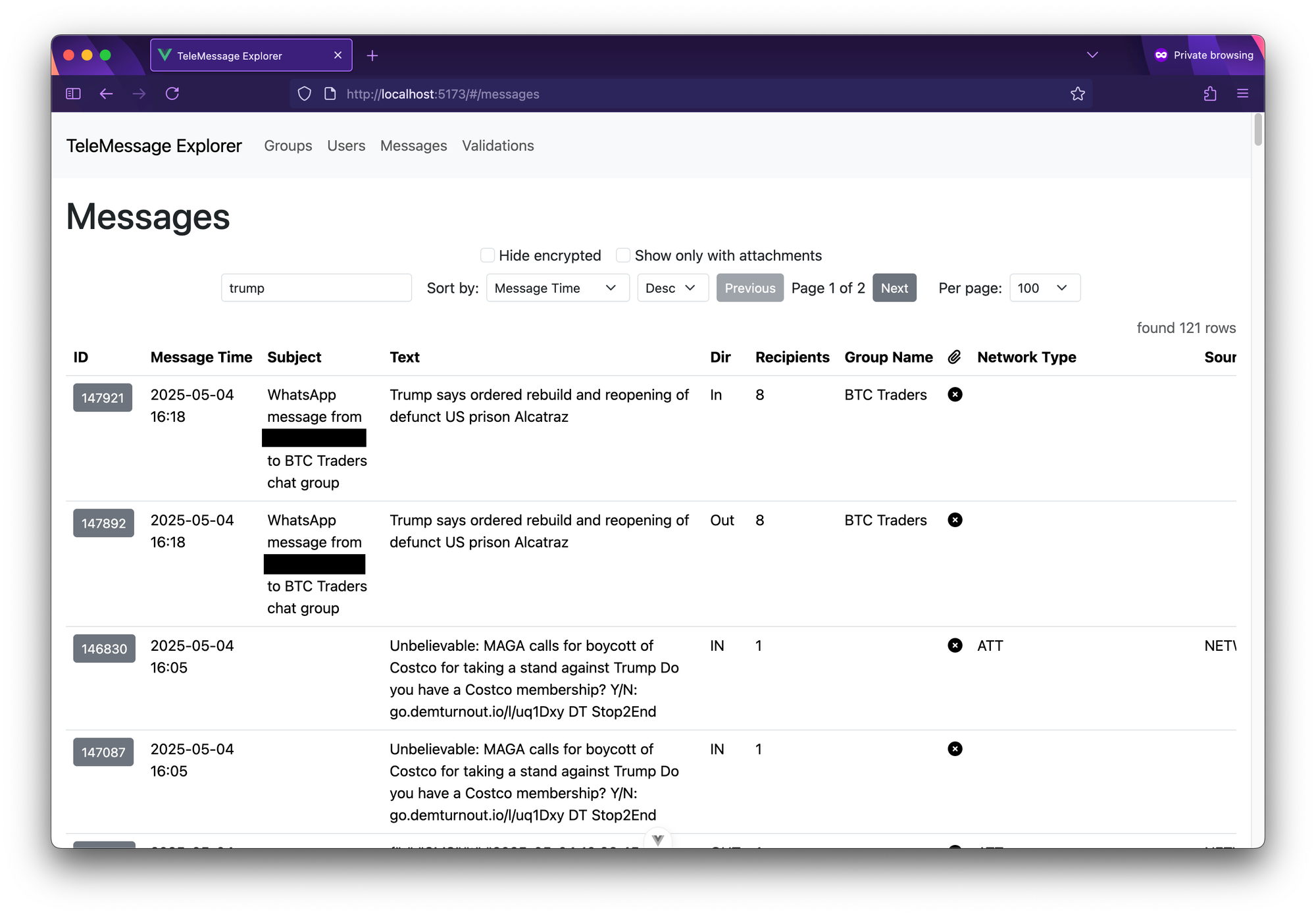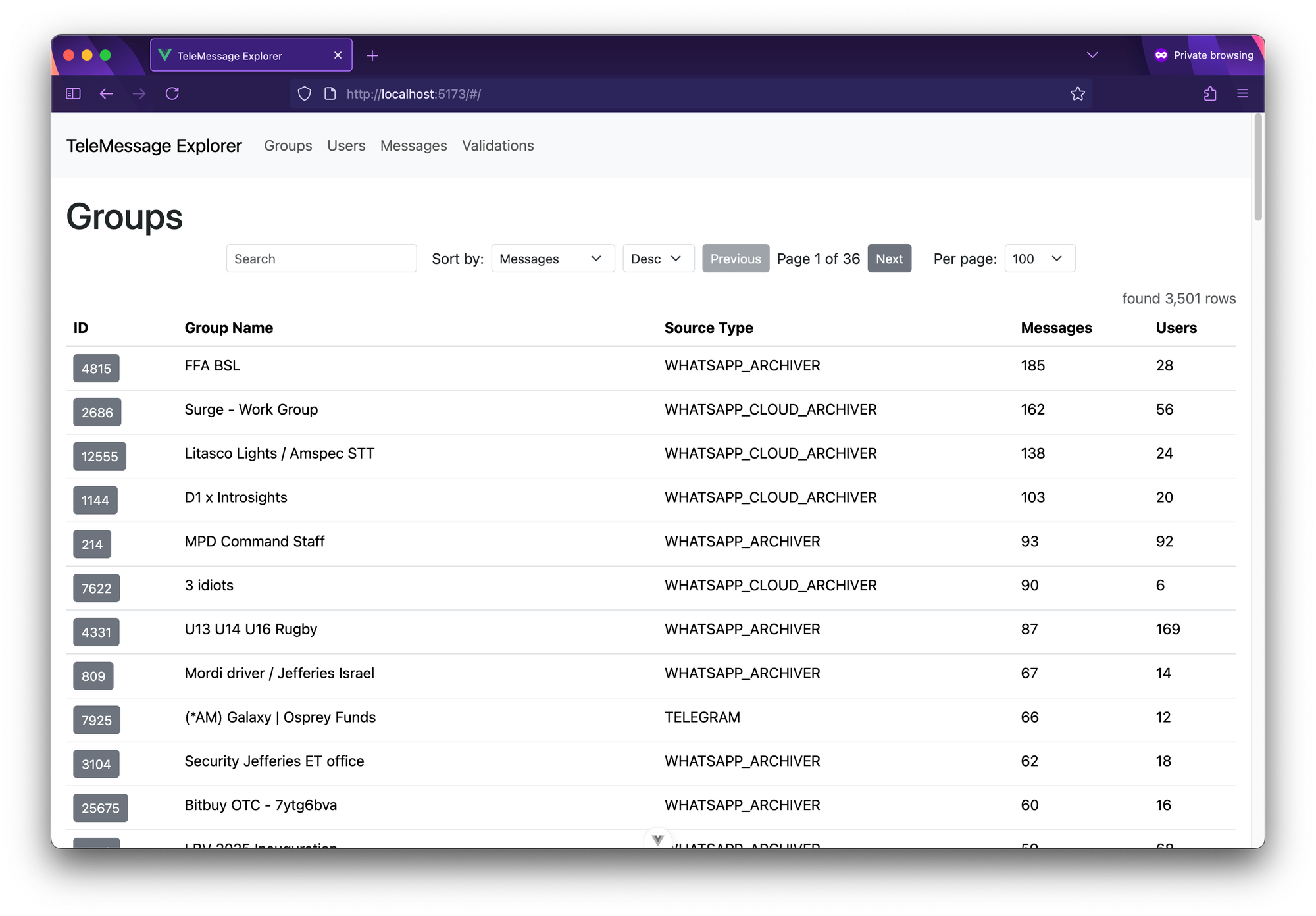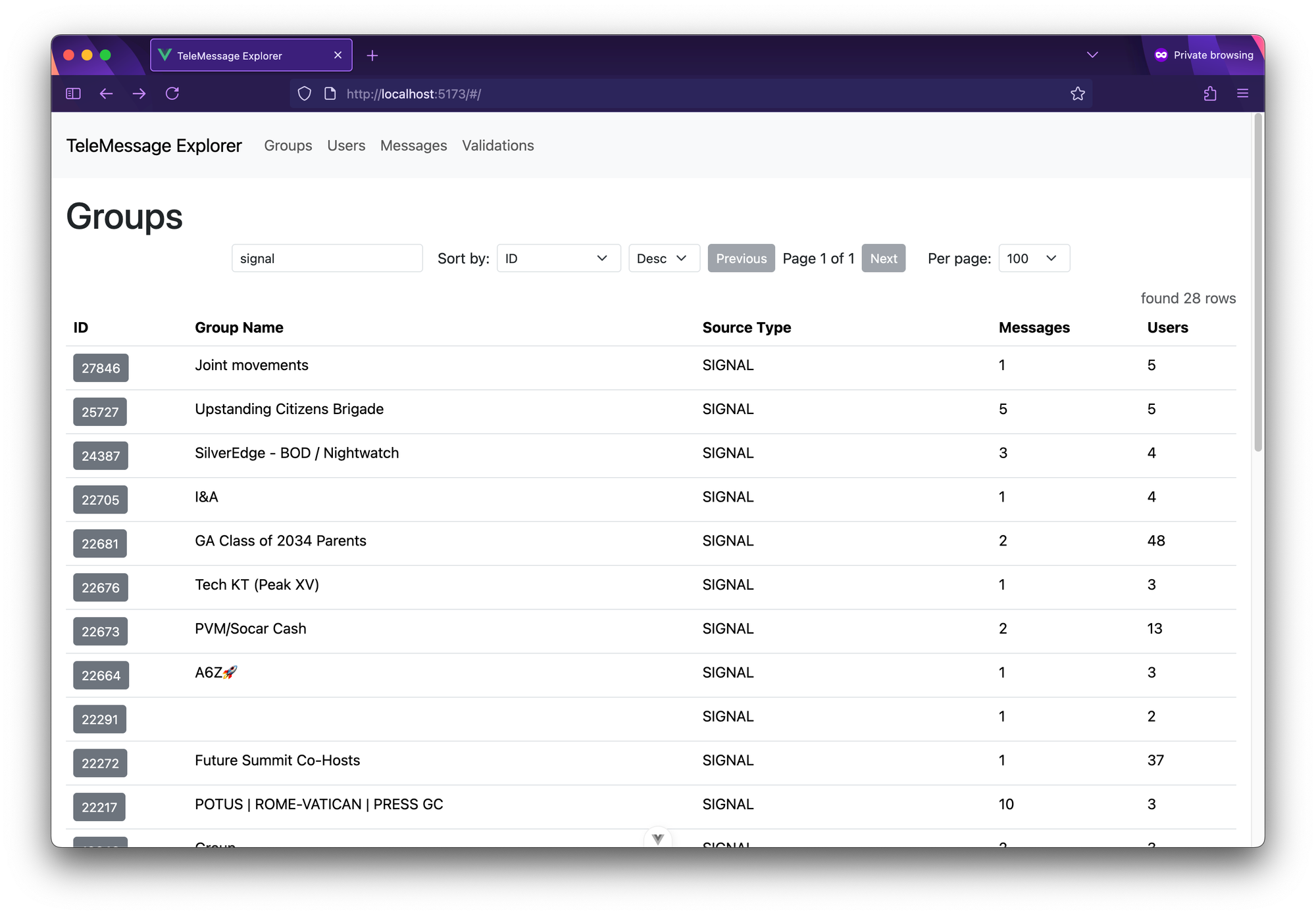 }Just like I searched groups for "signal", you can also use TeleMessage Explorer to search and filter users and message.