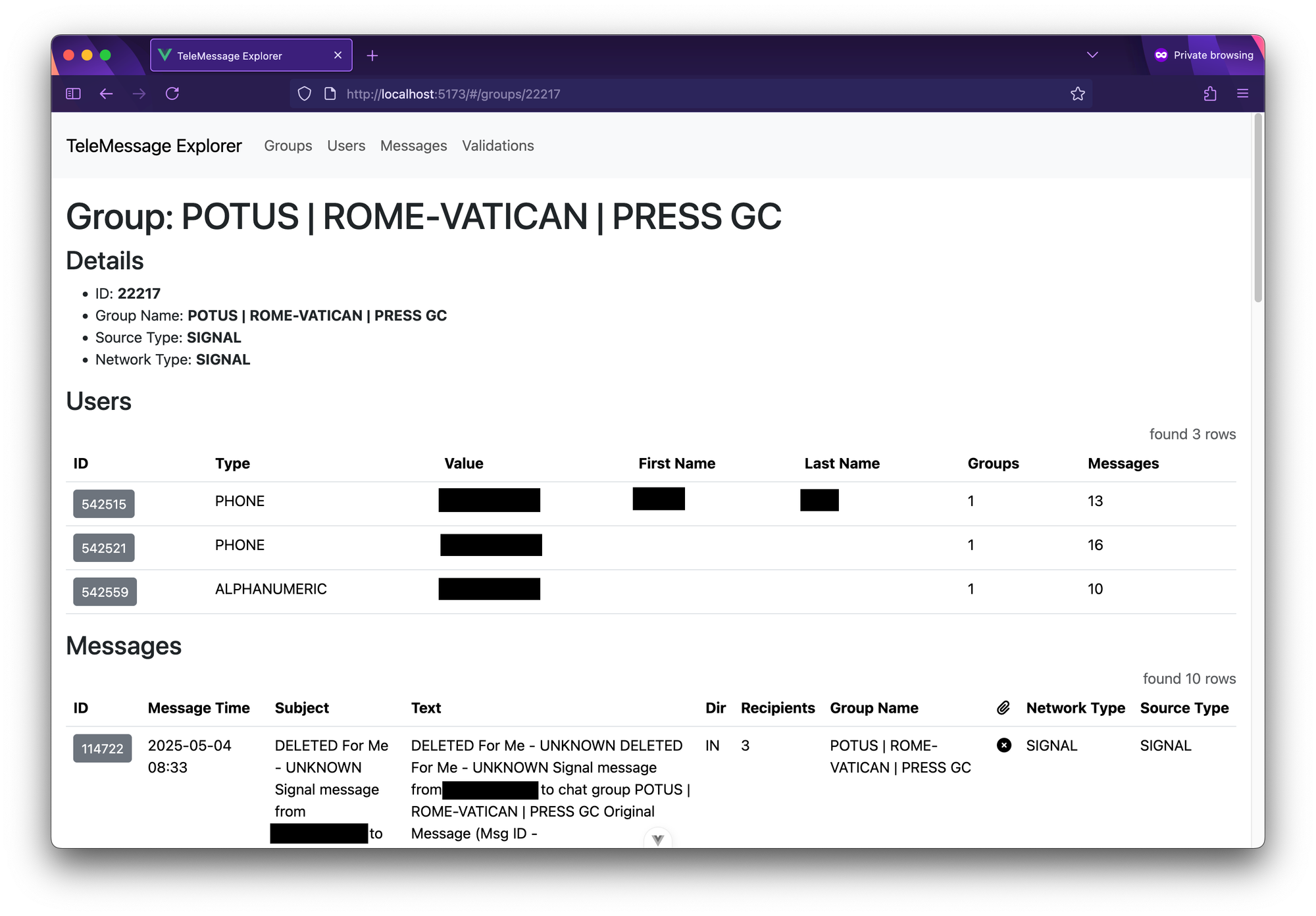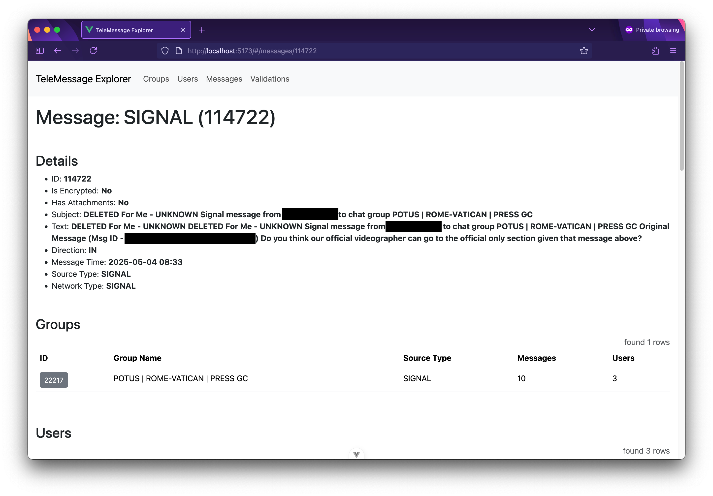 It was sent to this Signal group on May 4 at 8:33 am (I'm not entirely clear which time zone). If you scroll down on the message view, you can see the group and all the users in the group, followed by the JSON object itself – this is helpful to look at, just in case there was a bug in the crunching code or there are details in the JSON that TeleMessage Explorer didn't extract.