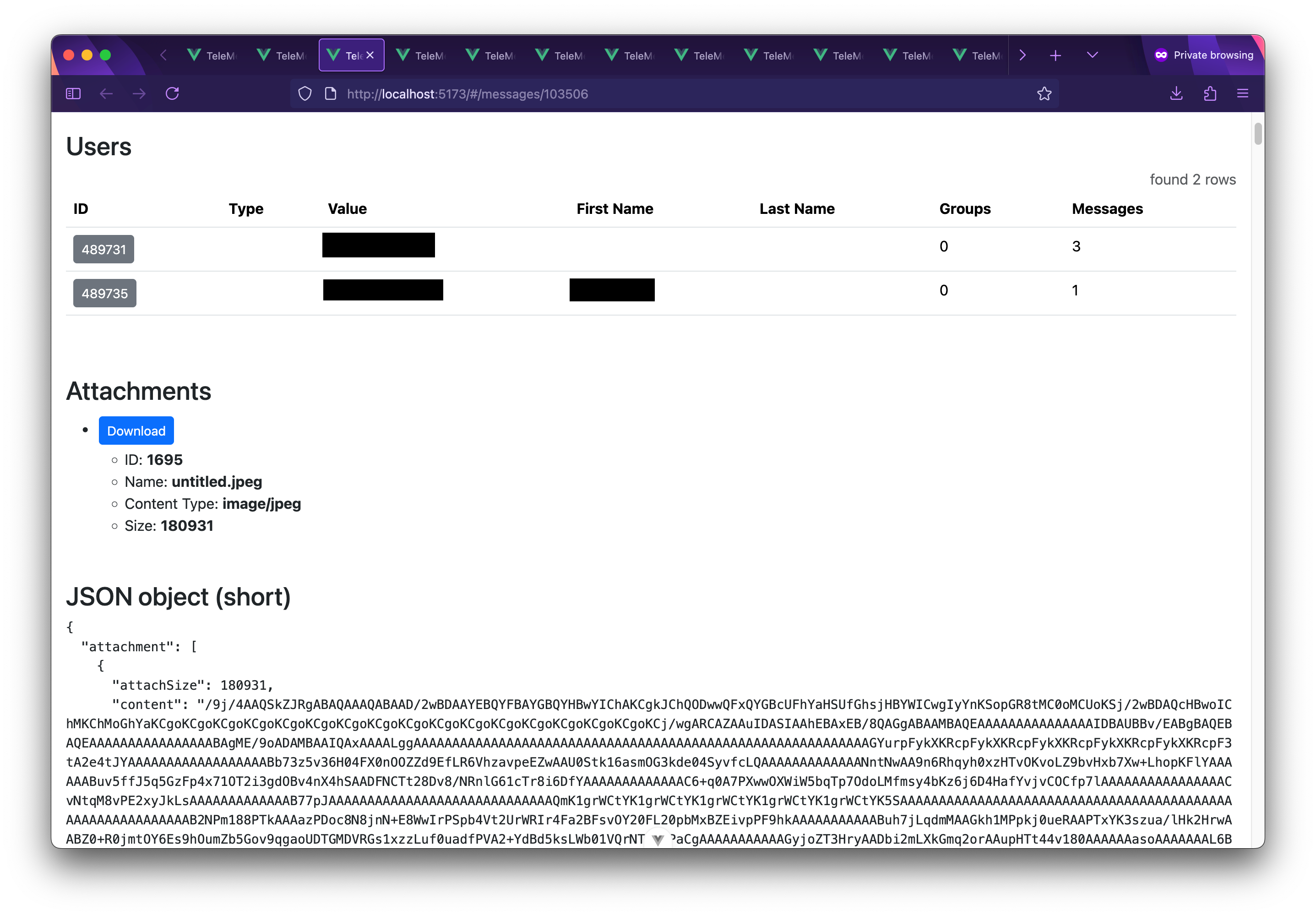 As you can see in the JSON object part, the attachment is Base64-encoded, and included directly in the JSON object that was extracted from the heap dump. For messages that have this sort of attachment, TeleMessage Explorer has a download button, which Base64-decodes the attachment and then saves it for you.