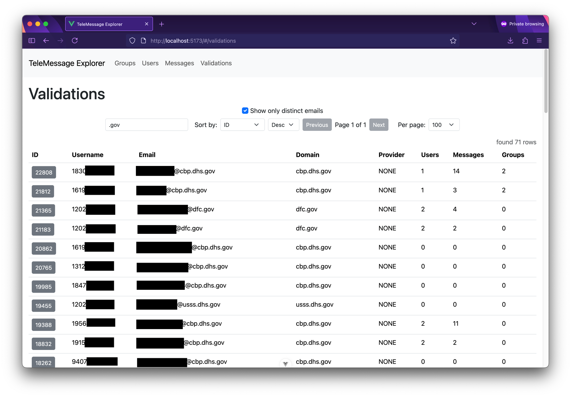 There are 71 .gov email addresses in the validation objects. The usernames are all phone numbers. If you click the ID of one of these validation messages, it shows you any messages and groups in the dataset associated with that phone number.