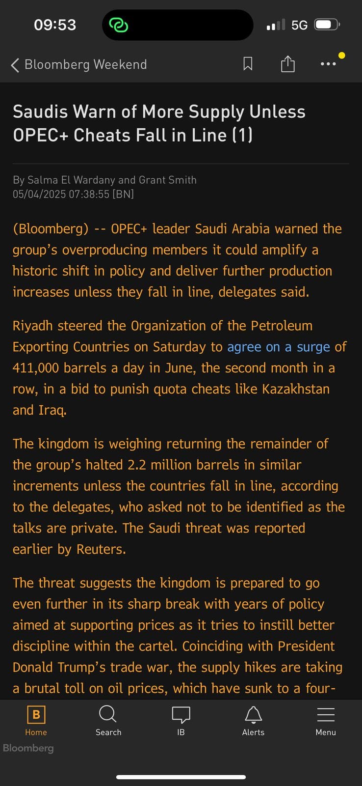 This attachment is a screenshot from a Bloomberg article about Saudi Arabia and OPEC+, taken on an iPhone, which also happens to be connected to a 5G network and is tethering internet.