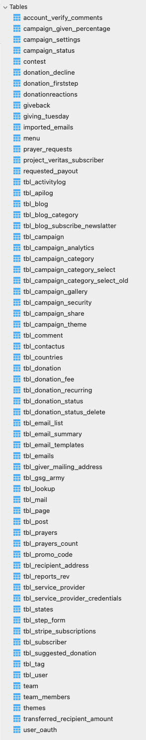 The tbl_users table has 170,944 rows -- this is probably everyone who has made an account on GiveSendGo... and everyone's passwords are hashed with md5, though at least they're salted