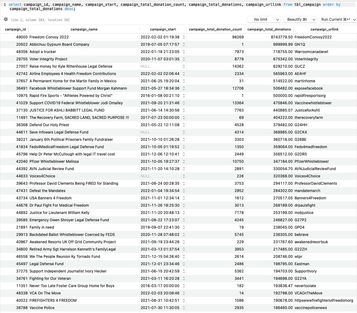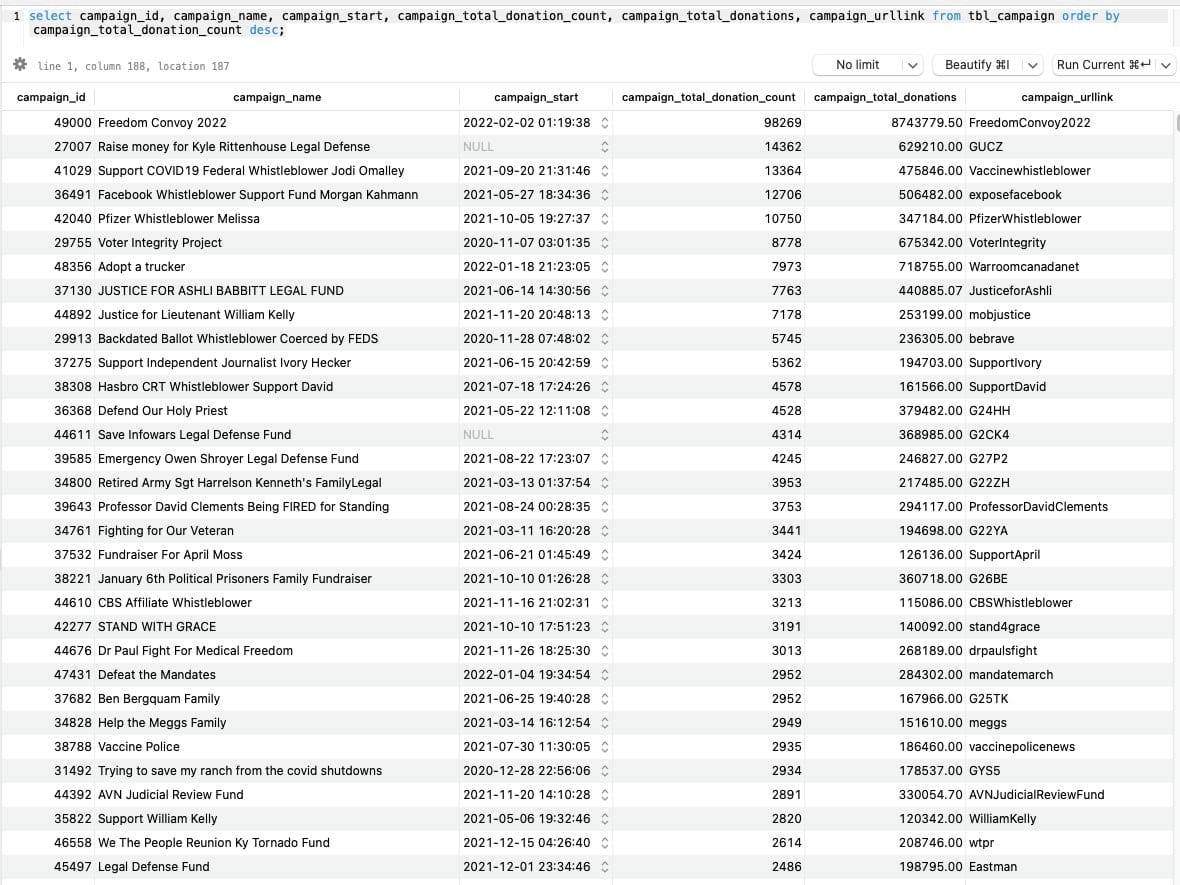 I'm starting to look at the latest GiveSendGo leak. The MySQL dump, called gsg_prod_v4_20220211.sql, appears to be a complete dump of their production database. It includes the entire donor history of everyone who's donated to any campaign before February 11, last Friday