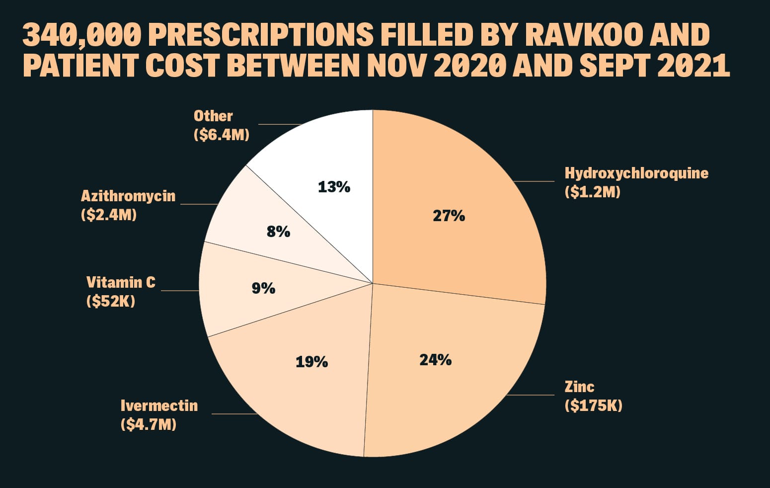 The hacker also sent me 340k prescription records hacked from Ravkoo, from Nov 2020 to Sept 11, 2021. The VAST majority of them are for bogus Covid drugs pushed by AFLDS. In fact, only 13% of the Rx's are for other drugs. According to pricing data, these sold for $8.5 million