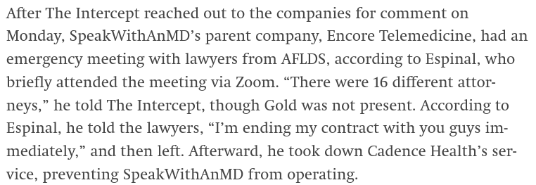 Yesterday, after reaching out to the companies, SpeakWithAnMD and AFLDS had an emergency Zoom meeting full of 16 lawyers, according to Espinal. In the meeting, he told them he was terminating service, and then left