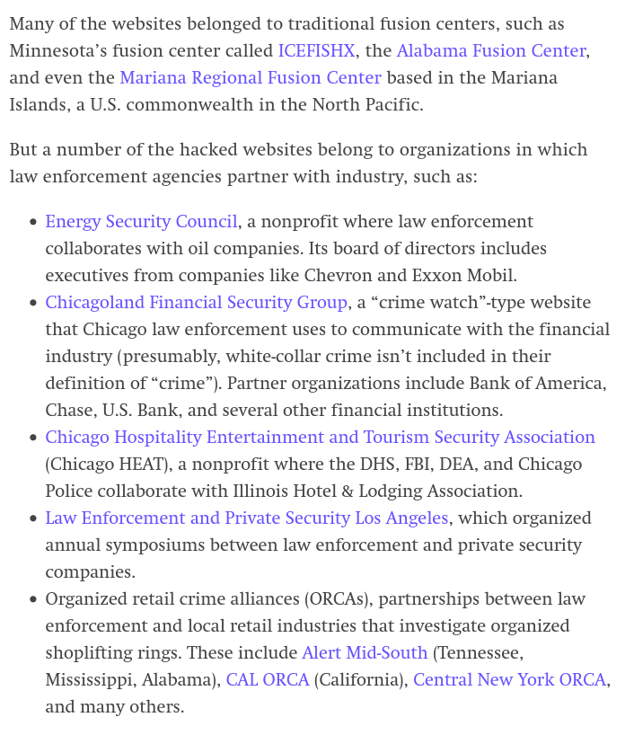 The hacked websites are mostly for "fusion centers" designed to share intelligence between feds and state and local cops. Many are devoted specifically to protecting oil companies, banks, and other industry