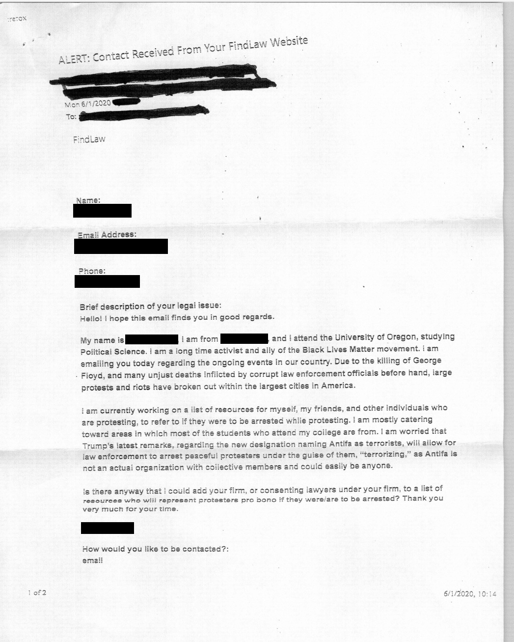 Here is an anecdote I discovered in the data, among hundreds of thousands of others. A week after George Floyd's murder, a student in Oregon contacted law firms asking for consent to add them to a list of pro bono legal resources for protesters