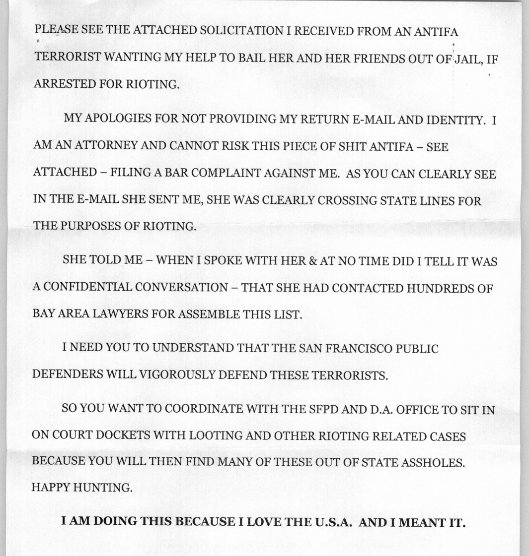 A Bay Area lawyer who received this message was pissed. He mailed this anonymous, unhinged, all-caps rant to the Marin County DA – "CANNOT RISK THIS PIECE OF SHIT ANTIFA [...] FILING A BAR COMPLAINT AGAINST ME". He ended it with "HAPPY HUNTING"