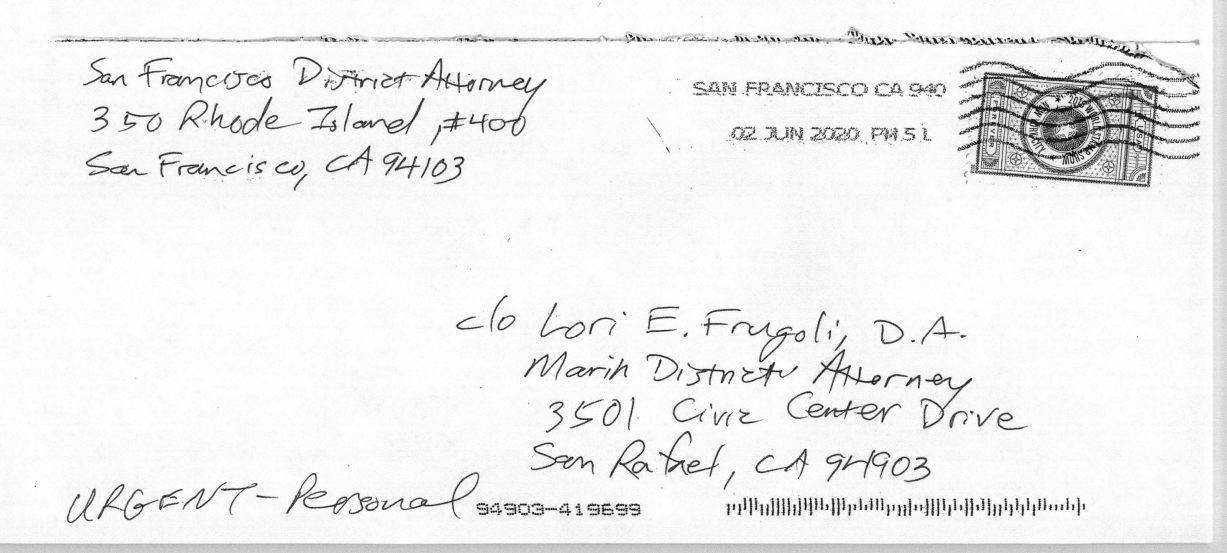 The return address on the envelope is the SF DA's office – we couldn't confirm if the lawyer works with them