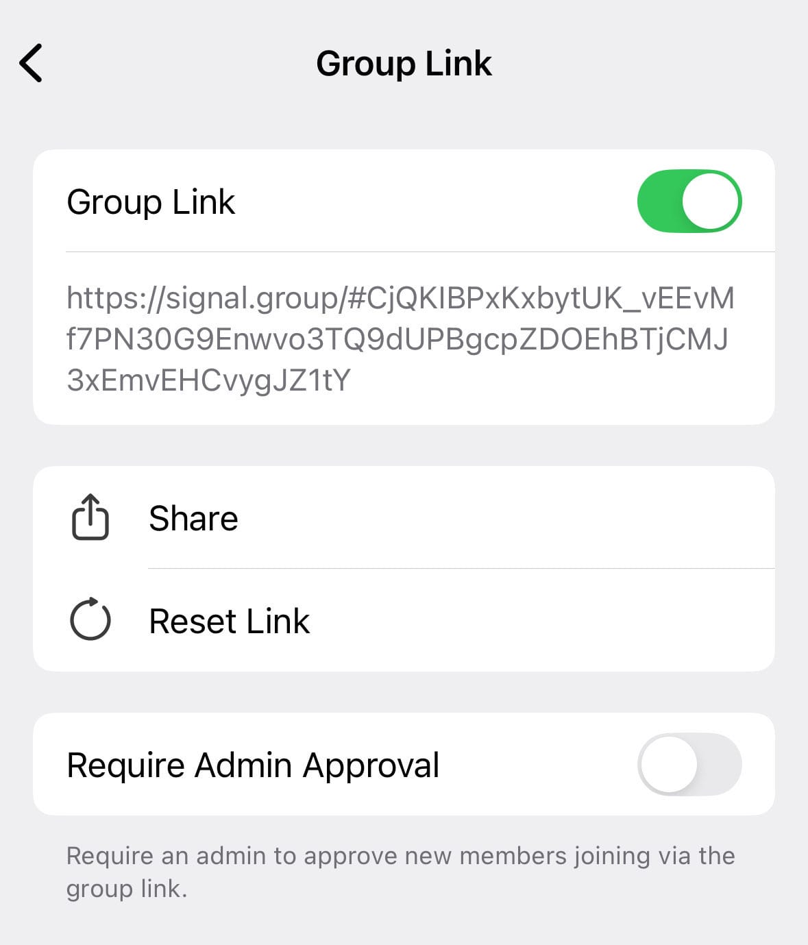 - Go to group settings > Group Link. Turn on Group Link, and also turn on Require Admin Approval.