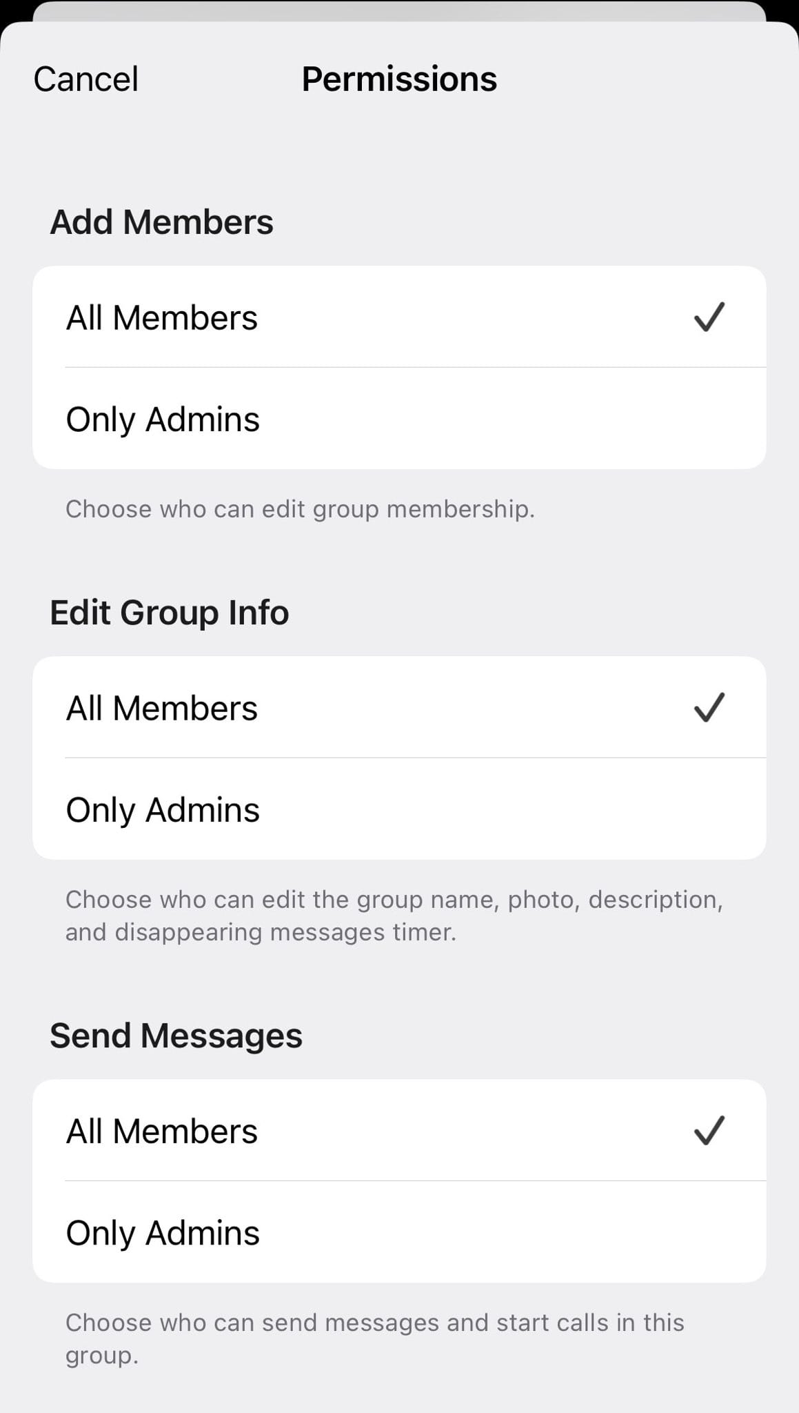 - Go to group settings > Permissions. Change Add Members and Edit Group Info to Only Admins, but keep Send Messages to All Members.